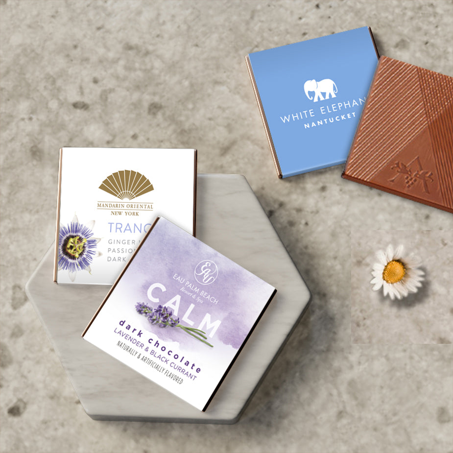 Our customization options ensure that every creation reflects your properties' style. Elevate your guests' experience and make every occasion truly memorable with chocolates that are decadent and offer a personal expression of your refined preferences. Each personalized guest amenity is offered to enhance your guests' satisfaction.